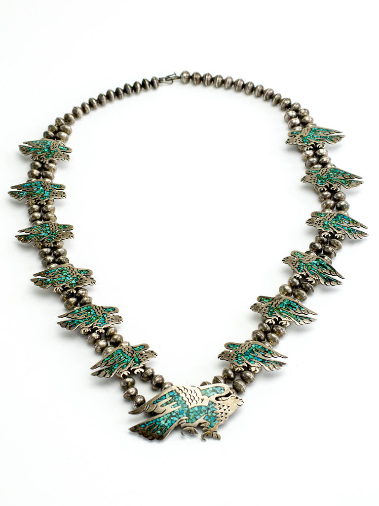 This antique Native American eagle necklace dazzles with Sterling Silver and turquoise inlay. Legend has it that spotting an eagle during prayer means that your wishes are granted! Featuring 12 eagles, including a bold center one, and 164 hand-crafted Sterling Silver beads, this all-original piece has never been restrung. A delightful treasure for any collector ready to soar!