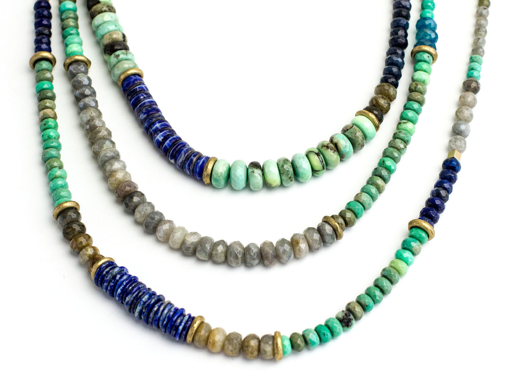 This striking 3-tier necklace combines blush deerskin with Labradorite, Sapphire Jade, Lapis Lazuli, Peruvian Opal, African trade beads, Chalcedony, and vintage brass accents.