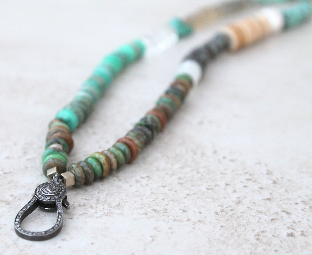 A gorgeous mix of Peruvian Opal, Bone, faceted Labradorite, Rock Crystal Quartz, Golden Rutilated Quartz, one large Baroque Pearl and natural Turquoise; all hand-strung to create this STUNNING necklace.