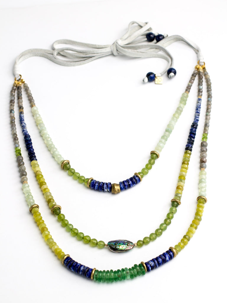 "Nature's Respite" balances both soft vibrancy and non-vibrancy - using beautiful stones such as Lapis Lazuli, Pehrenite, Jade, Yellow Opal, and brass accents. A center abalone shell adds depth to the stone mix. Off-white soft Colorado deerskin with stones make this adjustable necklace a showstopper.