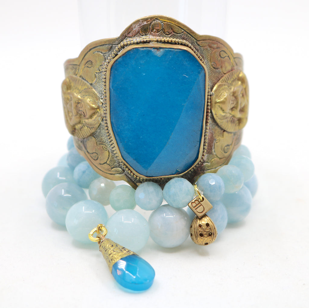 This eye-catching stack of three features a large faceted blue agate cuff, sparkling morganite, and faceted agate stones. "A Day In Bali" stack offers a playful blend of a Tibetan chalcedony and metal bauble charms - for a truly unique look!