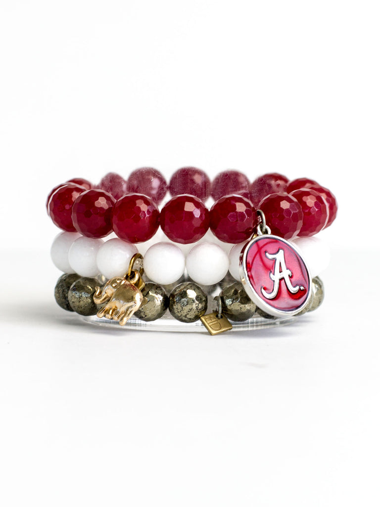 Celebrate Alabama's next win with our Blessings' Roll Tide stack. Cranberry agate, white agate, and pyrite bracelets with licensed Alabama team logo charm. A small gold-filled elephant charm adds to the spirited stacks.