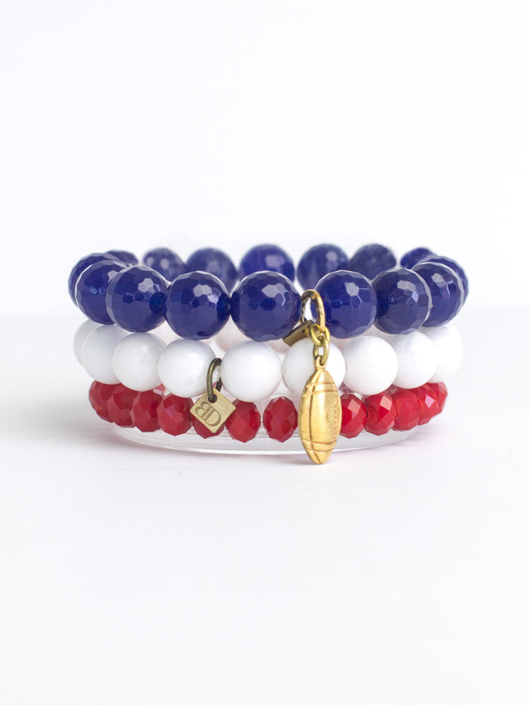 Stand out in style with our new Blessings' Ol' Miss Stack. Stranded faceted blue agate, polar white jade and red opaque crystals complete this spirited stack with a brass football pendant.