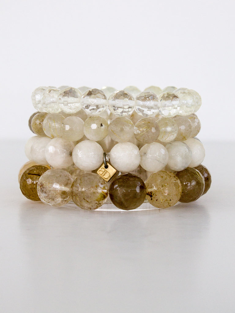 Faceted Rutilated Quartz, Moonstone, & Crystal Quartz are tone on tone of anticipated happiness.