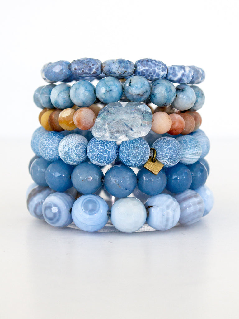 These 6 stone bracelets of Sapphire Jade, blue Lace Agate, blue Crystal Quartz, Lapis Lazuli, and honed Honey Amazonite.