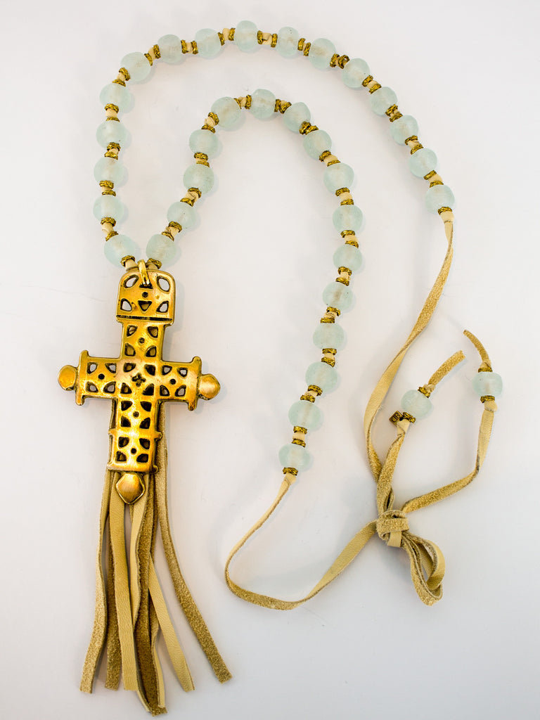 Extra large brass cross hangs proudly at the bottom, over a hand-knotted deerskin tassel.