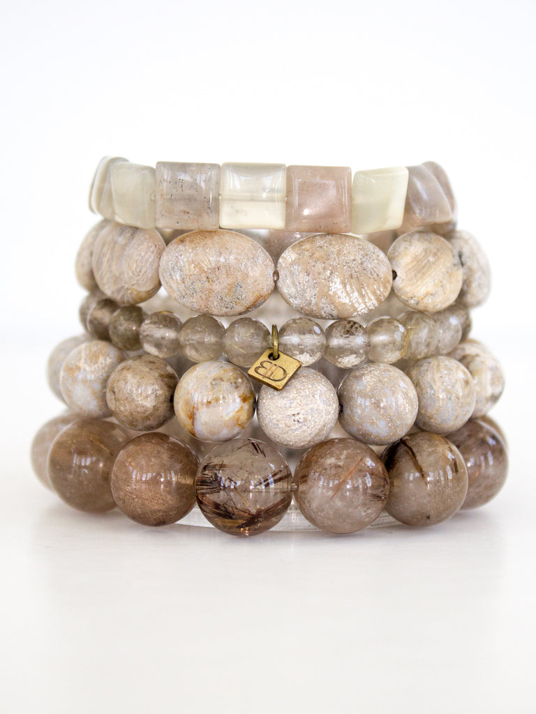 Moonstone, Rutilated Quartz, and Fossil Jade stones ground this stack with neutrality and strength.