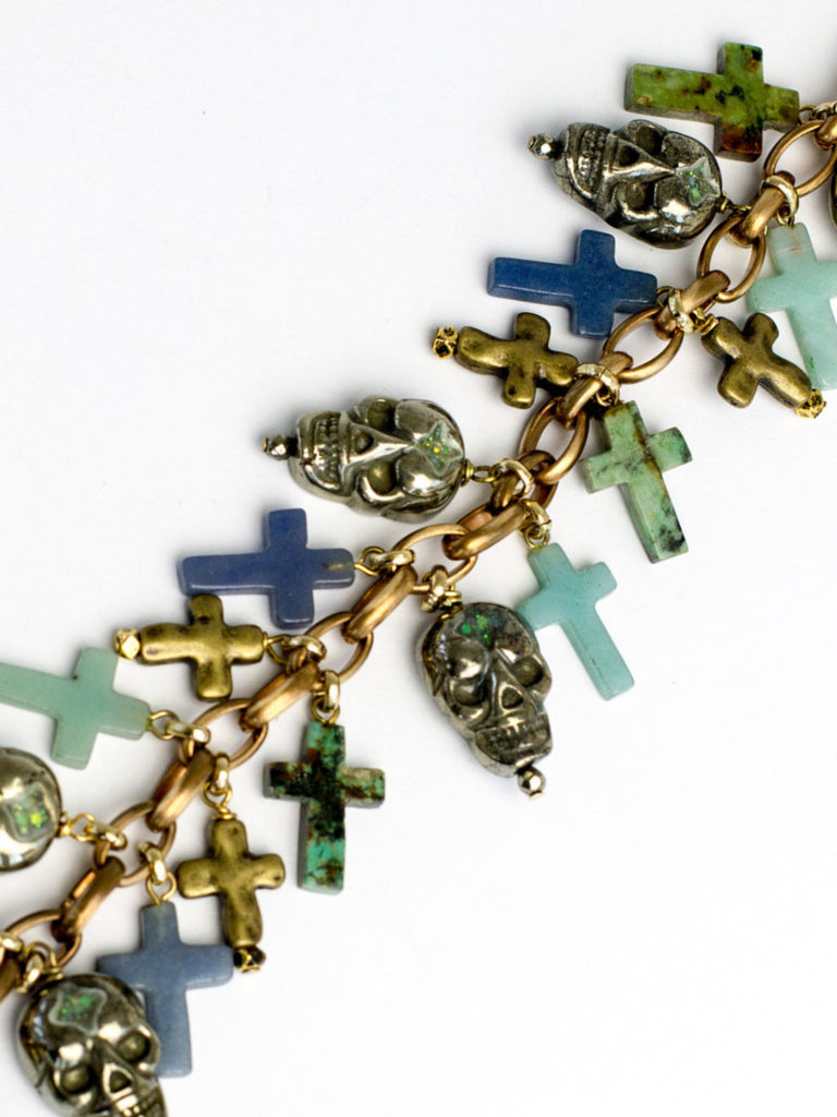 Fabulous Pyrite Skulls counterbalance stone and brass crosses. A "skull and cross" together symbolize both protection and magic. Solid vintage brass links with a gold plated toggle clasp.