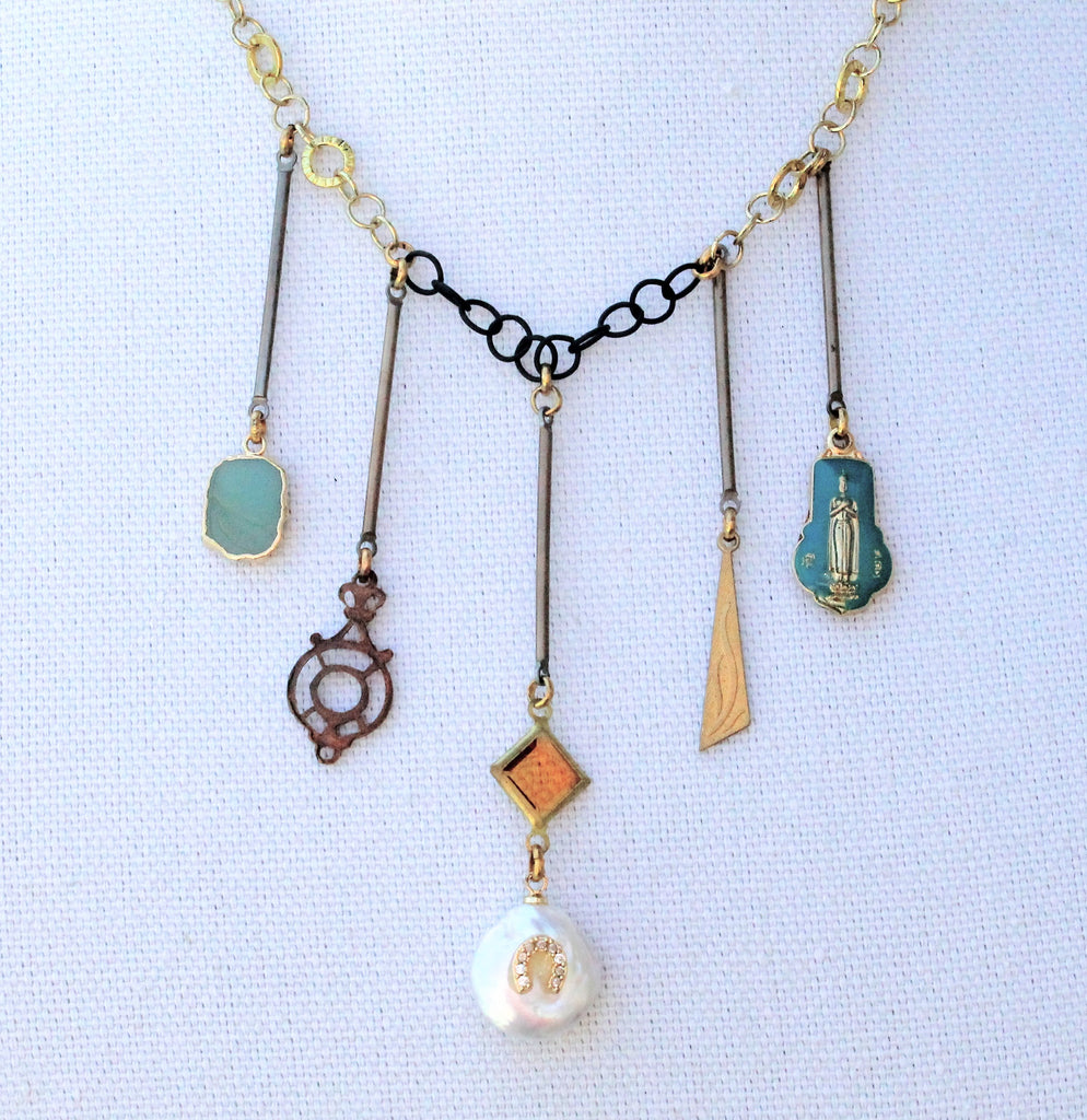 A one of a kind necklace with enamel, copper, pearl, and brass symbolic charms, found from all over the world. An oxidized Sterling Silver chain with brass links is the base for all of these treasures!