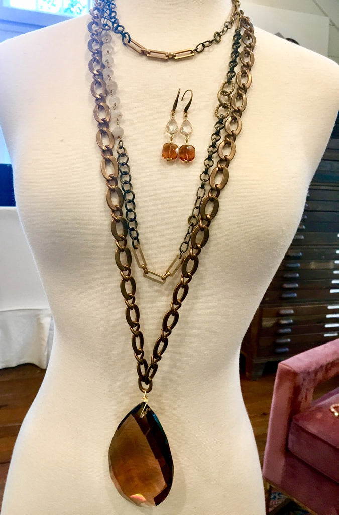 3) One of a kind necklace made of vintage bronze chain with a faceted vintage rock crystal tear drop pendant ($120.00)