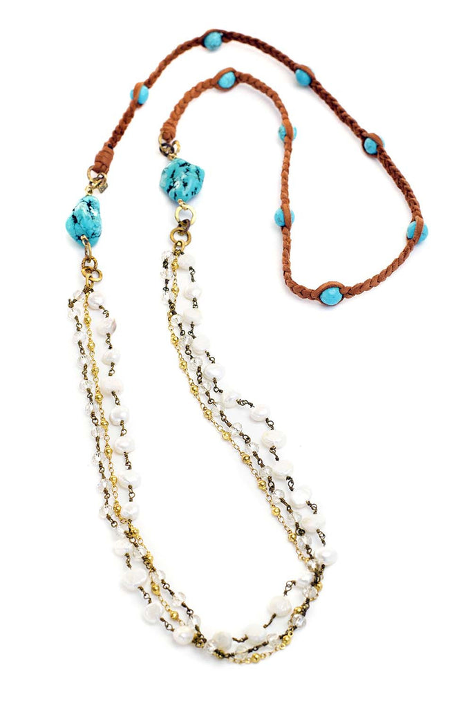 New design! A gorgeous medley of hand-braided deerskin, champagne glass, freshwater pearls, & large accent stones. Superior craftsmanship & attention to detail. Available in two color ways. May be worn long or doubled. 42-46"