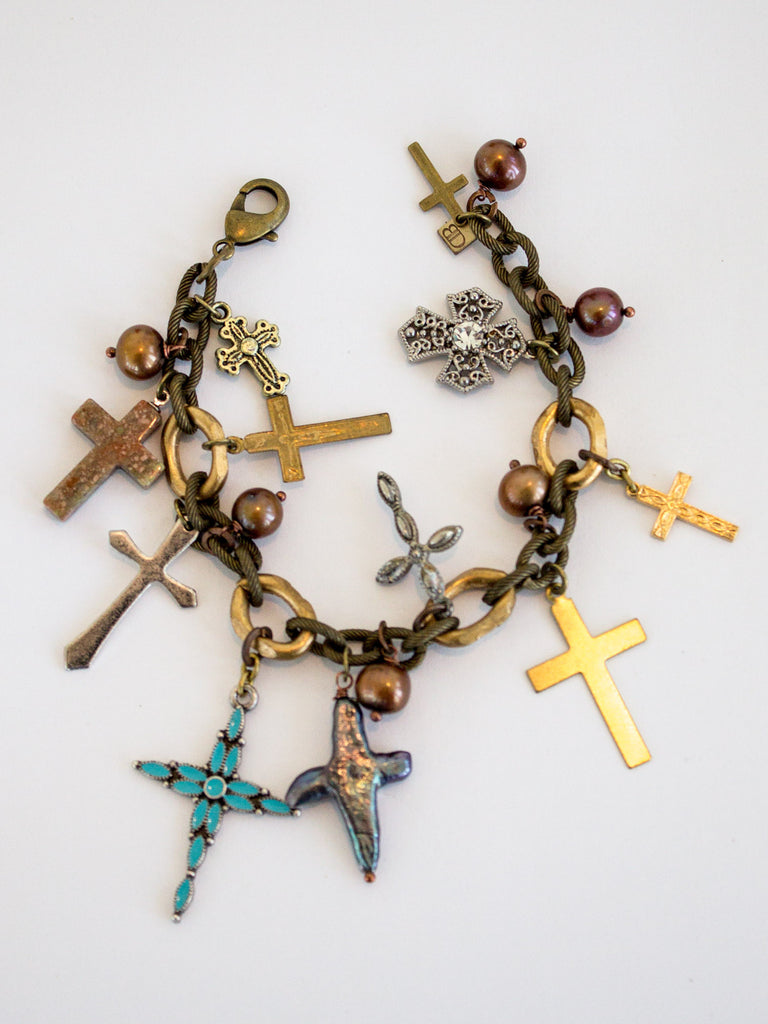 Medley of crosses from around the world - on mixed link bracelet with chocolate freshwater pearls.