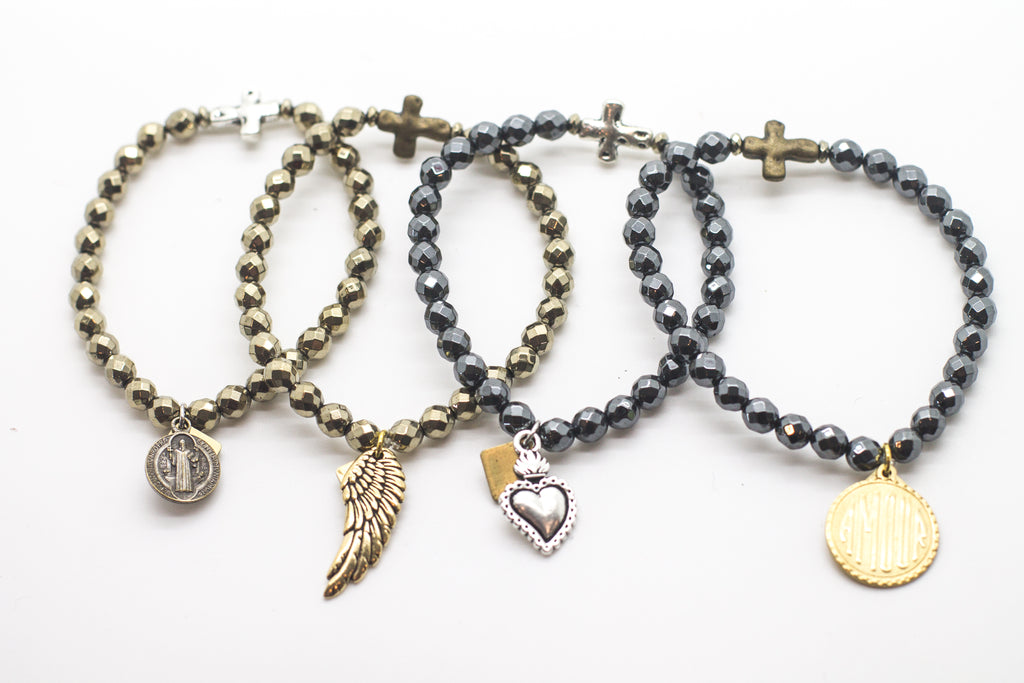 Faceted pyrite or hematite hand-strung with a silver or antique gold sideways cross.