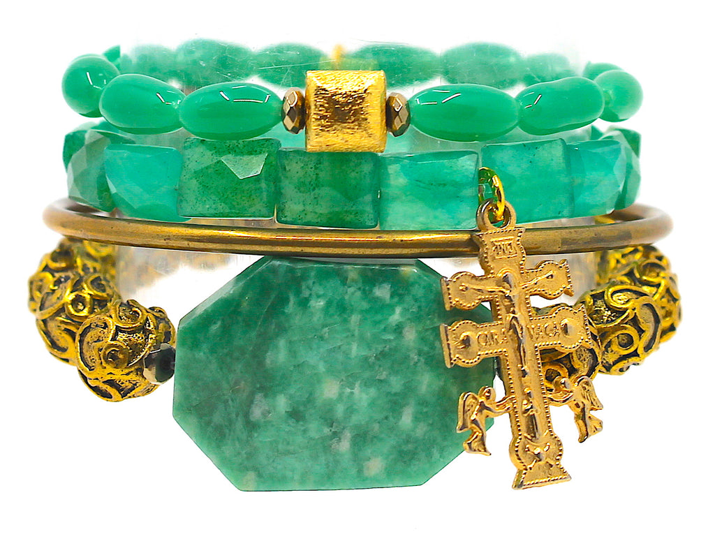 Textured brass & faceted green chalcedony make this stack of protection truly one of a kind.