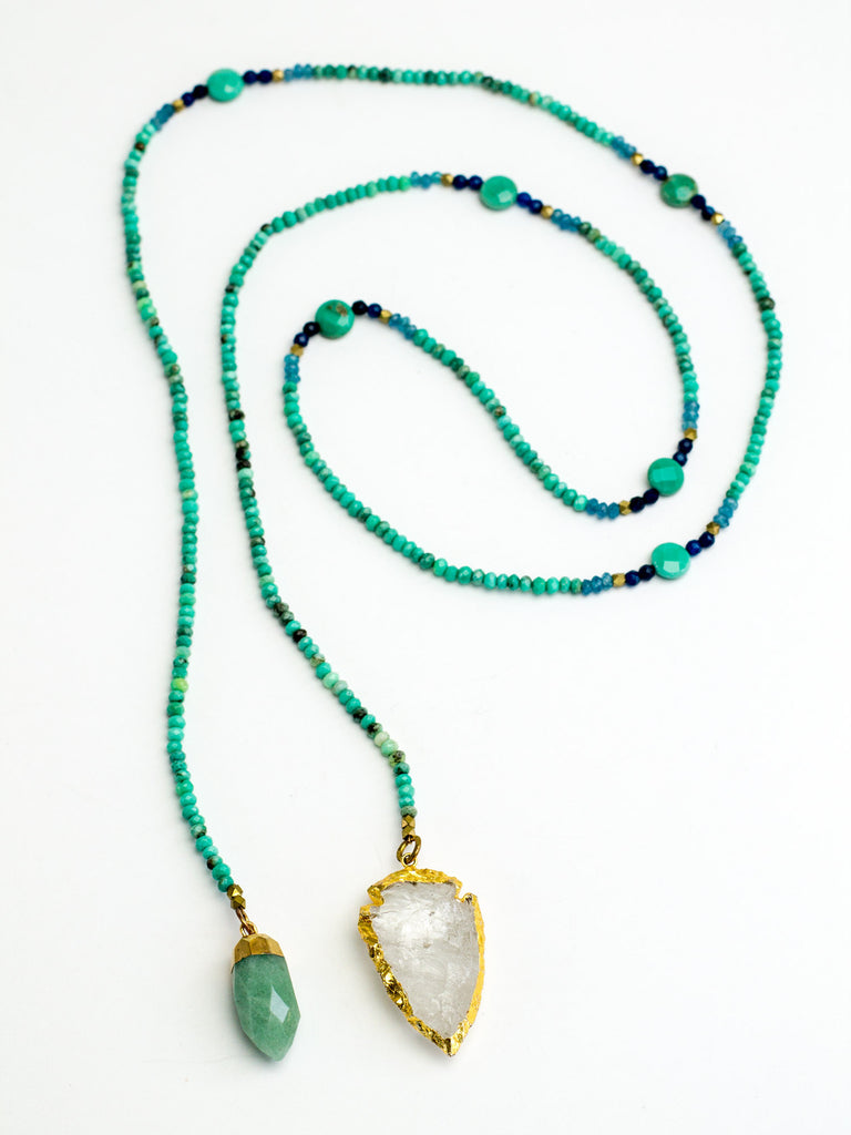 We adore this hand-strung lariat of Peruvian Opal, Blue Jade, with an Aventurine pendant & Crystal Quartz Arrowhead.