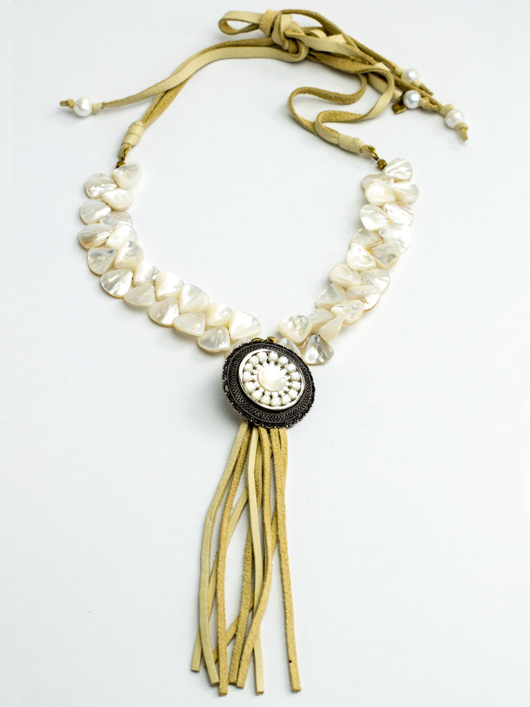 This proudly rests on a Camel deerskin and Mother of Pearl necklace - that may be worn long, as a choker, or somewhere in between.
