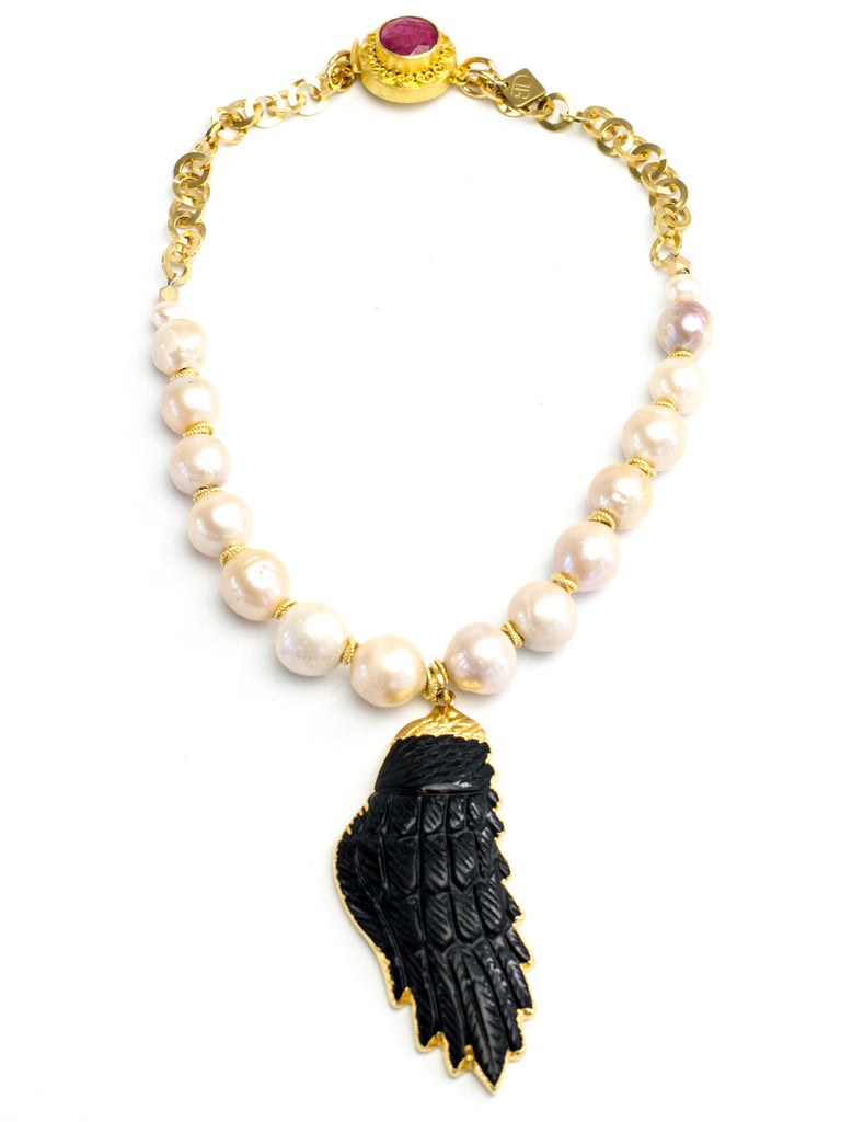 Stunning blush pearls are hand-strung with 18kt gold vermeil spacers to hold a gorgeous hand-carved Onyx angel wing pendant. A vermeil & ruby clasp adds a special detail to the back of the neck.