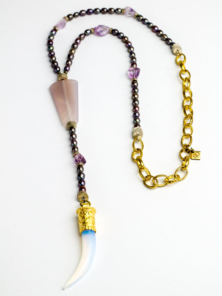 This violet-inspired piece has a mixture of Amethyst and Agate with an 18kt gold electroplated Opalite horn pendant.