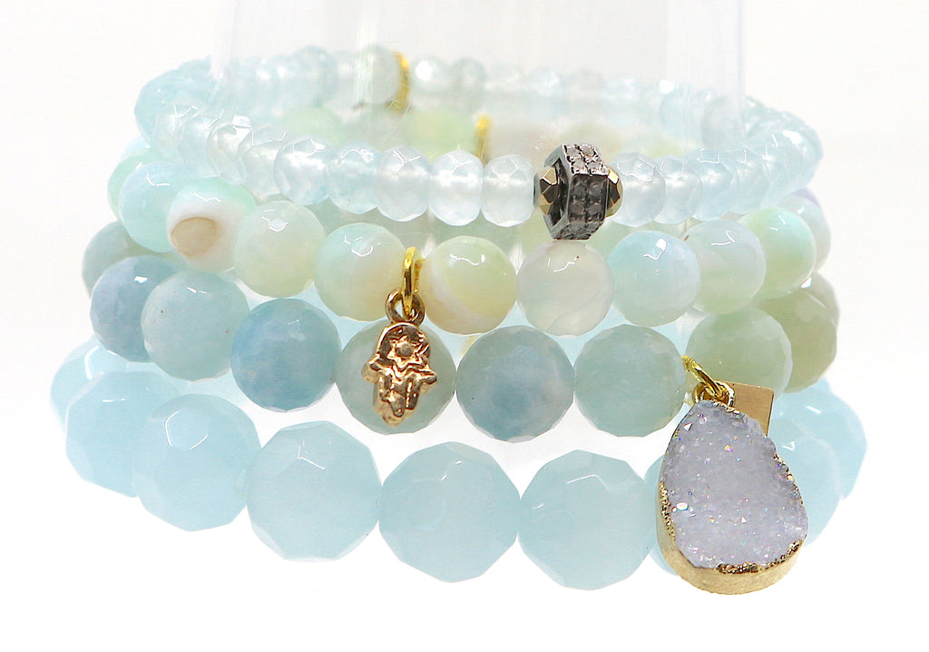 Faceted icy jade, watery morganite, and faceted pale blue aquamarine with a pave diamond center stone.  A simple pale blue druzy and golden hamsa add to its serenity.