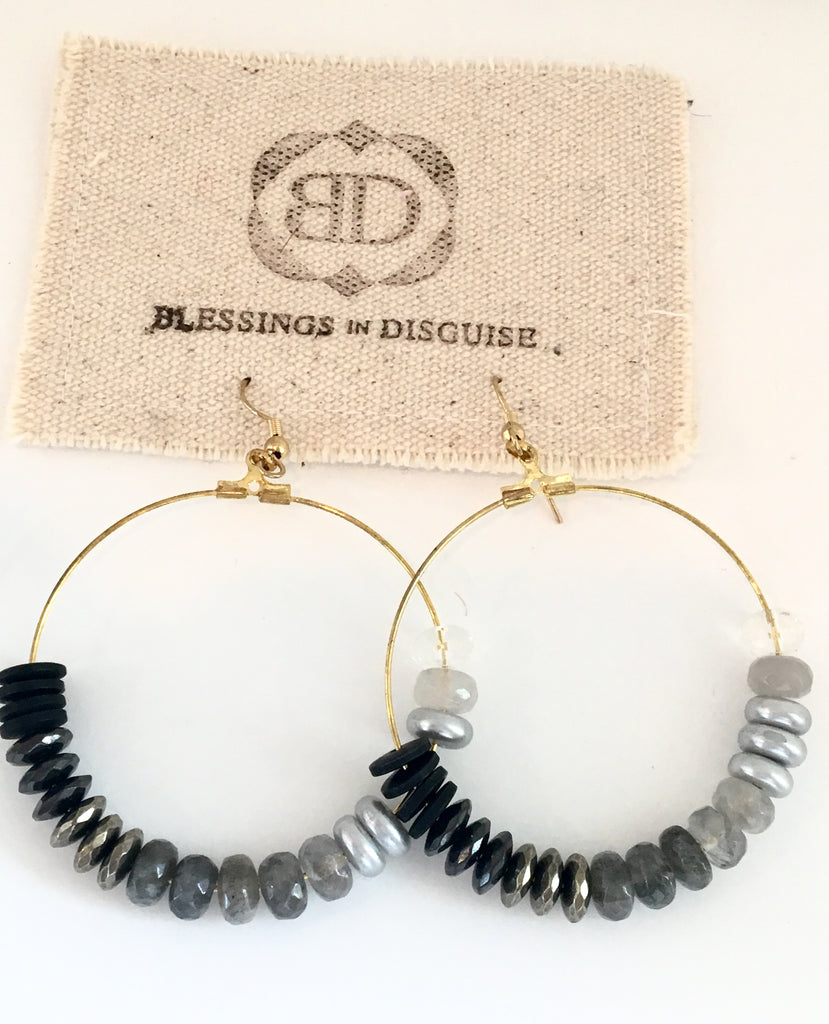 Hues of black/metallic on gold wire hoops are perfect for Fall and holiday apparel.