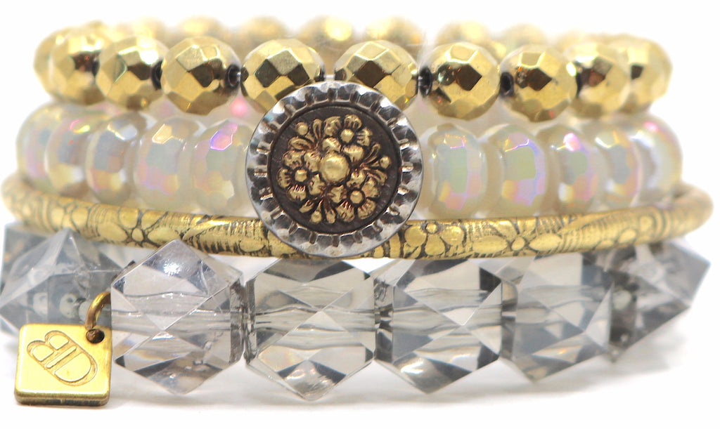 A striking mix of silver and gold: faceted glass bracelets with a carved bangle and golden pyrite makes this layered stack a mix that goes with everything.