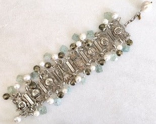 This unique bracelet blends faceted Aquamarine, Pyrite, and Freshwater Pearls to beautifully elevate a vintage Paris Souvenir piece from France—perfect for the jewelry lover with a wanderlust heart!