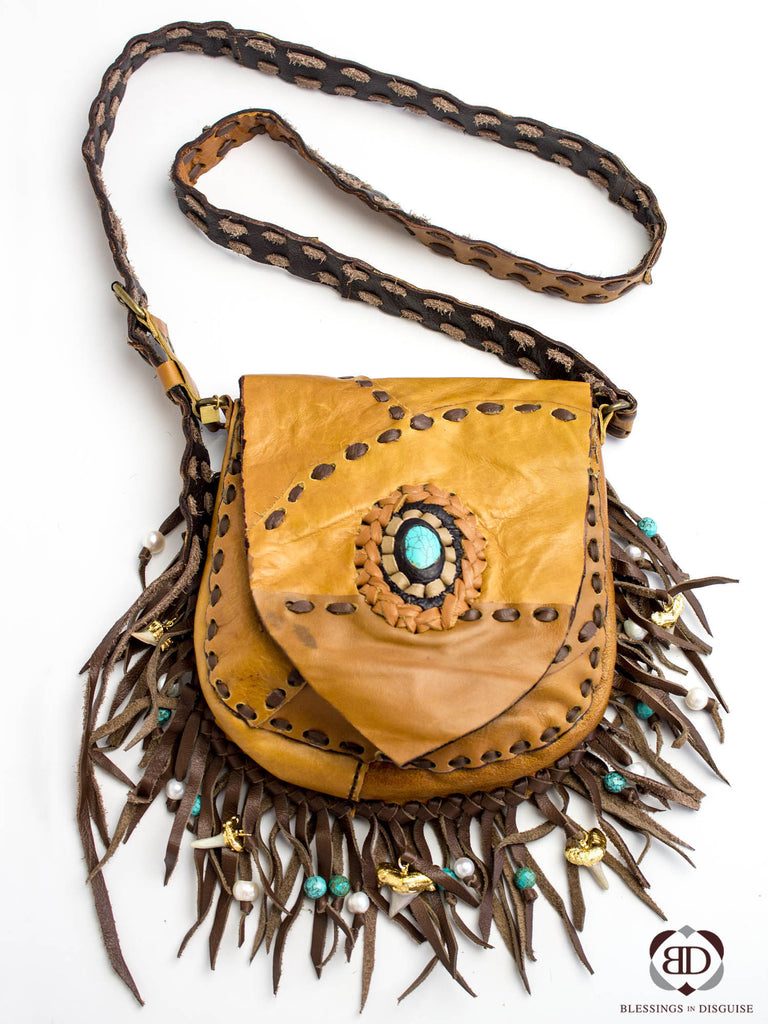 New! Hand-cut & hand-stitched brown leather handbag, with suede fringe. This hand-crafted handbag has turquoise, fresh water pearl, & 18kt gold electroplated sharks teeth. Solid brass hardware, adjustable strap, with natural turquoise center stone. Sweet Tooth is signed & one of a kind.