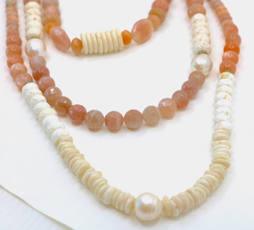 A 3-tier necklace with White Turquoise, Fossil, Labradorite, Sunstone, Bone, and vintage brass with Pearl & Pyrite accents.