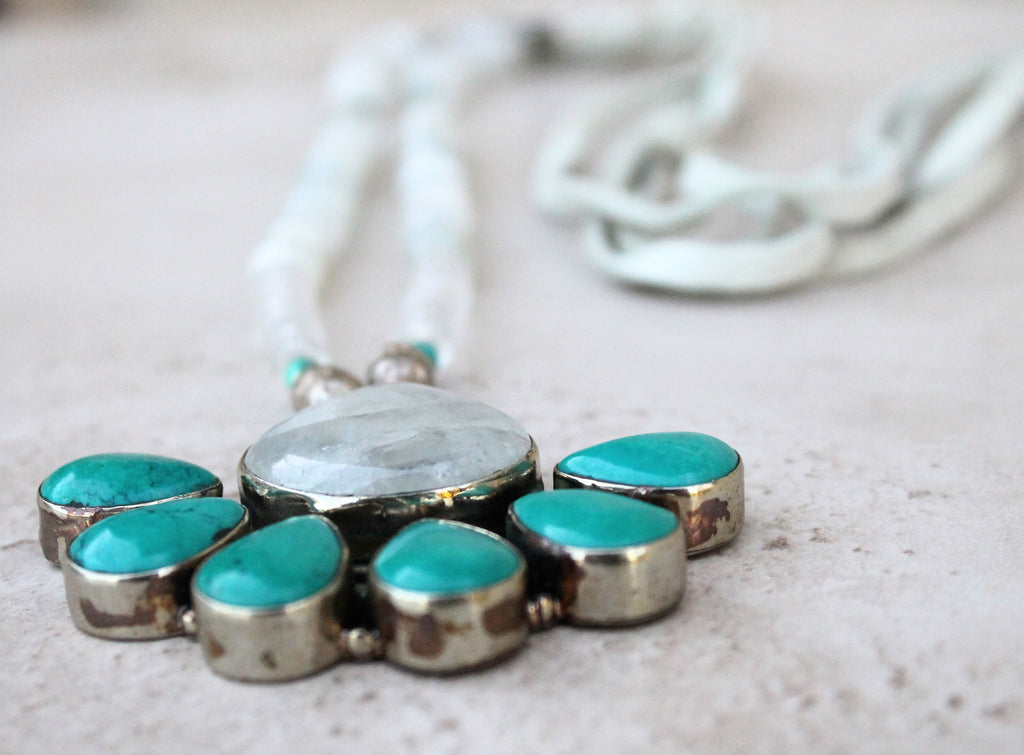 A large Moonstone & Turquoise flower pendant hangs center stage in this one of a kind necklace. Faceted Moonstone with Turquoise & Balinese silver accents. Soft white Colorado deerskin w Moonstone accents tie and make this an adjustable piece.
