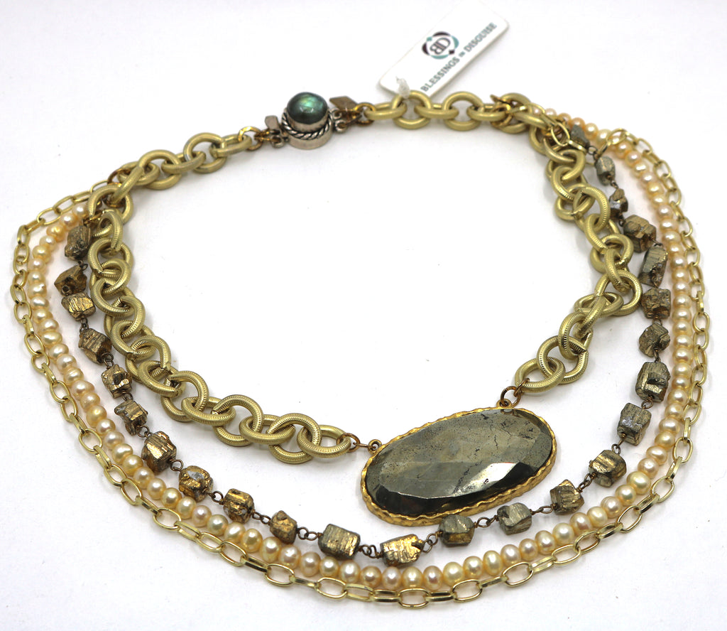 This multi-layered necklace has several interesting components: faceted nugget Pyrite chain with satin golden pearls & golden links. A large oval faceted pendant commands center attention.