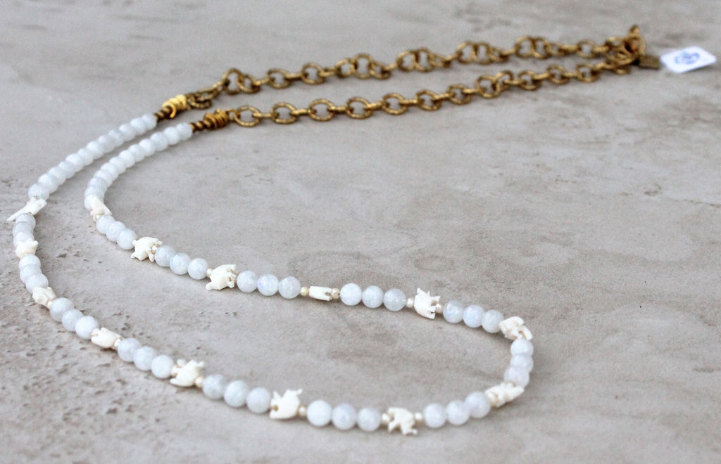 Hand-carved Bone elephants with Moonstone & seed pearls are handstrung on this long necklace.