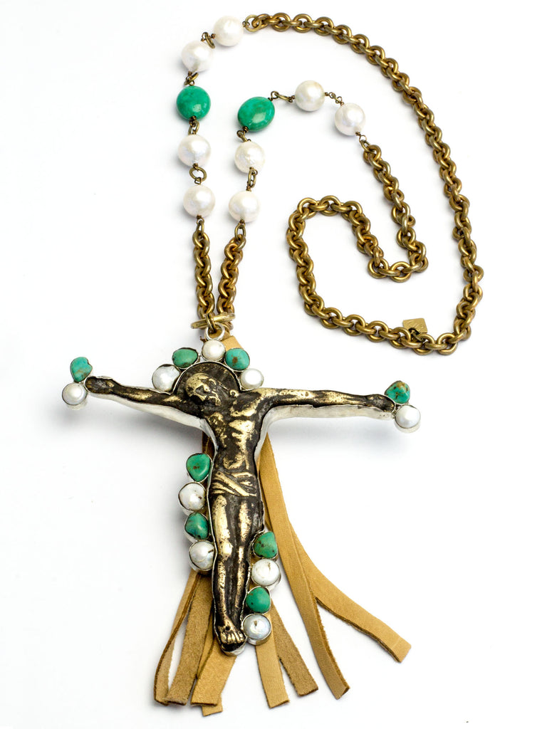 Antique Brass crucifix from Rome - encrusted with Freshwater Pearls and Turquoise.