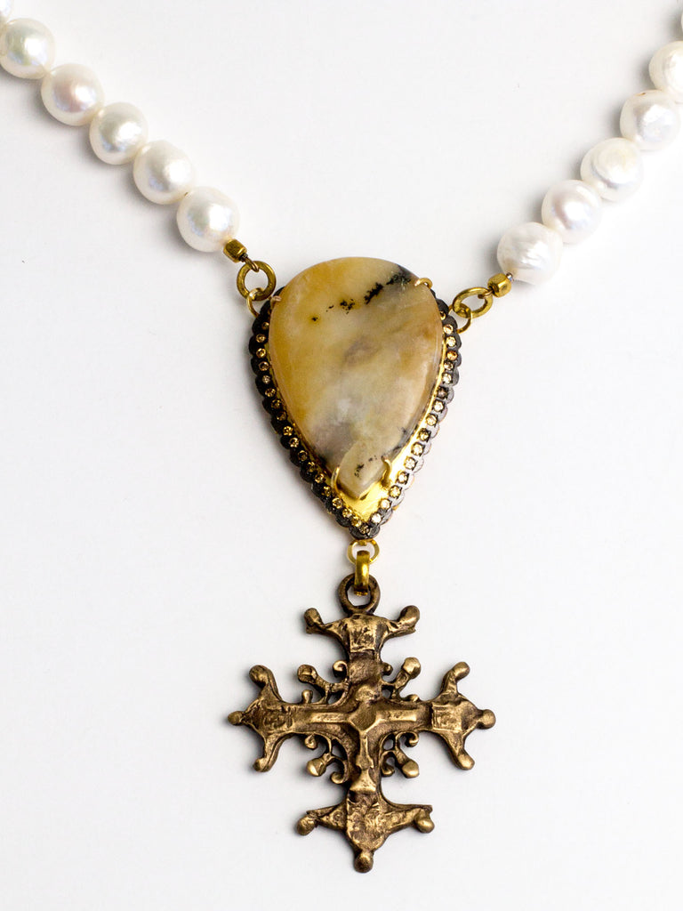 Hand-strung freshwater pearls with a large Peruvian opal and a solid bronze crusader cross.