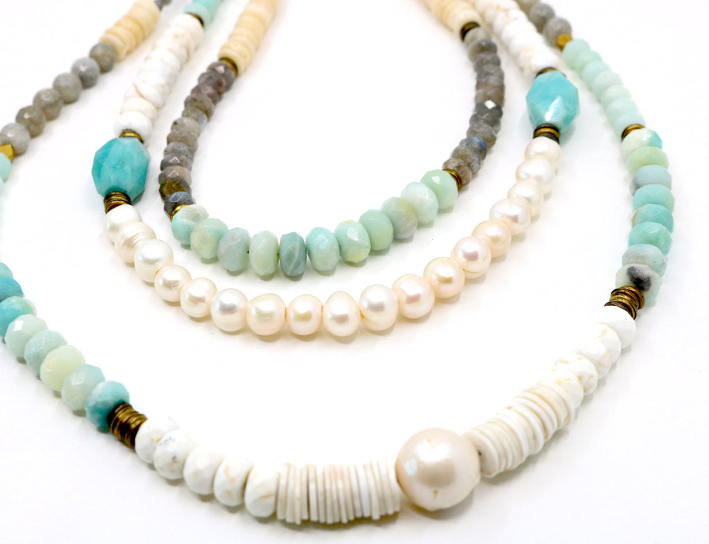 Dive into beachy vibes with this playful three-tier necklace featuring Amazonite, Labradorite, Pucca shells, freshwater pearls, and brass accents.